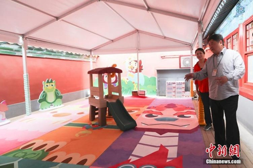 9月19日,为给带婴幼儿参观的观众提供一个洁净、舒适、安全的哺乳、护理与休息场所,故宫博物院首次开设母婴护理室。护理室南侧约55平方米左右的小院落里,则设置了儿童滑梯、桌椅等设施,可供小朋友们玩耍、休憩。中新社记者盛佳鹏 摄