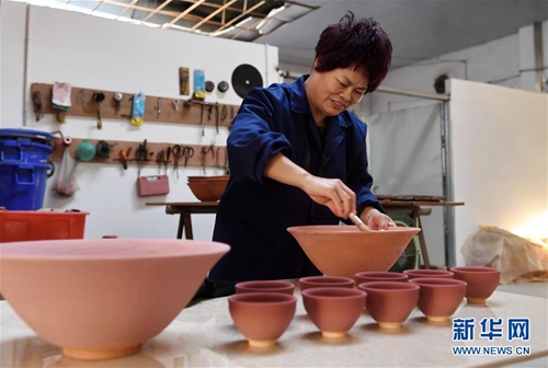 10月29日,建阳建盏传统技艺传承人李细妹在给建盏坯体上釉。 新华社记者 林善传 摄