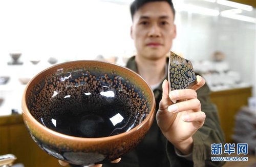 10月29日,建阳建盏传统技艺传承人周建平在展示他烧制的鹧鸪斑建盏(左)和宋代鹧鸪斑建盏碎片。新华社记者 林善传 摄