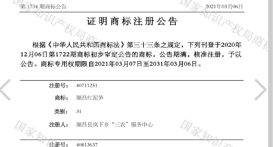 近日,从国家知识产权局商标局中国商标网得知,“顺昌红泥笋”地理标志证明商标注册成功。 顺昌红泥笋因在红壤中自然生长而闻名,笋体细长,呈蒲瓜状,上部尖而中下部肥大、圆浑,长度约26-32cm,基径约6-8cm,鲜笋可食率约65%;外壳较薄,笋壳表面一般为紫褐色或棕褐斑点,密布棕褐色粗绒毛;笋肉厚,中间空腔小、颜色洁白、表面有光亮;肉质细嫩、鲜脆爽口。其营养物质含量高,尤其是蛋白质和氨基酸含量高, “顺昌红泥笋”每100g鲜笋含水分≧85%、蛋白质≧4.1g、碳水化合物≧5.7g、纤维素≧0.8g、氨基酸≧4.6mg、铁≧0.1mg。 近年来,我县以建设“武夷山水”品牌为契机,加大商标品牌创建力度,夯实基础建设。截至今年3月,共拥有驰名商标3件,地理标志证明商标8件。(谢舒楚) |