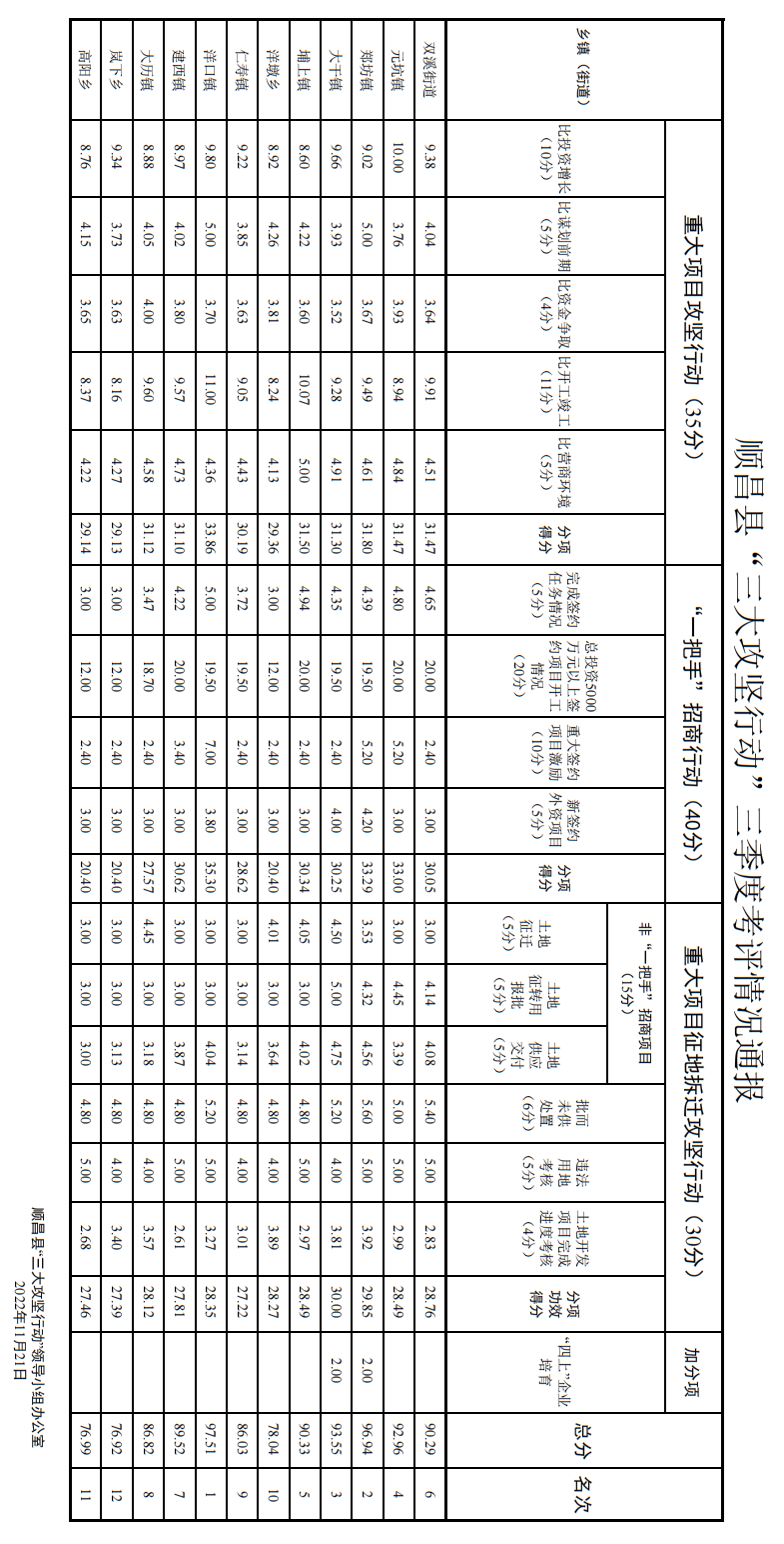 21日 顺昌县各乡镇(街道) “三大攻坚行动”第三季度 考评情况公布 谁的总得分最高? —— 排名情况 —— 第1名 洋口镇 总得分:97.51 第2名 郑坊镇 总得分:96.94 第3名 大干镇 总得分:93.55 第4名 元坑镇 总得分:92.96 第5名 埔上镇 总得分:90.33 第6名 双溪街道 总得分:90.29 第7名 建西镇 总得分:89.52 第8名 大历镇 总得分:86.82 第9名 仁寿镇 总得分:86.03 第10名 洋墩乡 总得分:78.04 第11名 高阳乡 总得分:76.99 第12名 岚下乡 总得分:76.92 具体考评情况如何,往下看请把手机横过来,点击可看大图