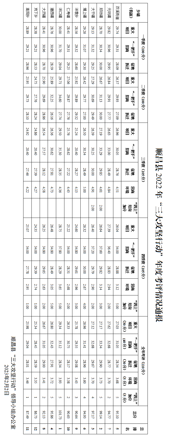 今天 顺昌县各乡镇(街道) “三大攻坚行动”2022年度 考评情况公布 谁的总得分最高? —— 排名情况 —— 第1名 洋口镇 总得分:101.73 第2名 郑坊镇 总得分:99.14 第3名 大干镇 总得分:97.17 第4名 建西镇 总得分:95.86 第5名 双溪街道 总得分:95.10 第6名 埔上镇 总得分:94.93 第7名 元坑镇 总得分:94.77 第8名 大历镇 总得分:92.13 第9名 洋墩乡 总得分:90.64 第10名 仁寿镇 总得分:90.63 第11名 高阳乡 总得分:87.49 第12名 岚下乡 总得分:86.73
