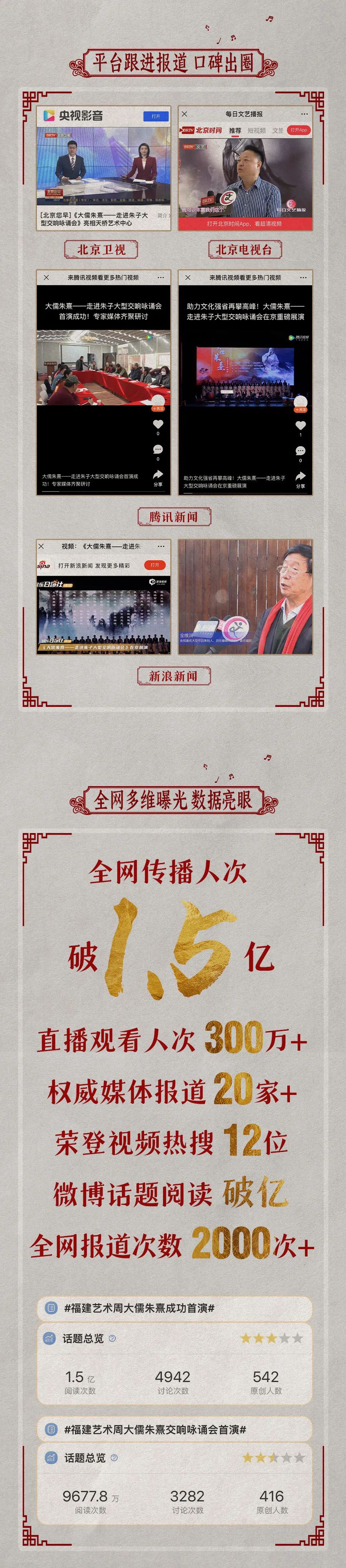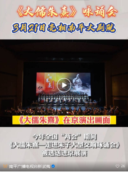 今年全国“两会”期间 《大儒朱熹——走进朱子大型交响咏诵会》 就被选送进京展演 全网传播人次破1.5亿 集中展现了南平近些年 加强朱子文化精品创作的 最新成果 ↓↓↓