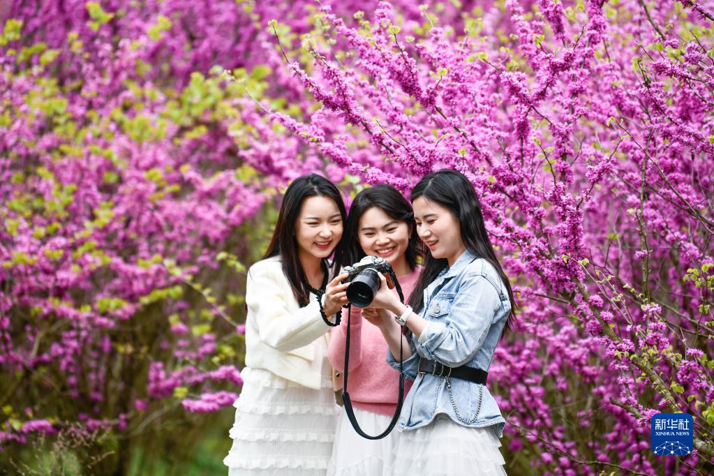 4月7日,游人在贵州省岑巩县天马镇玉门洞景区的紫荆花园赏花拍照。 近日,位于贵州省黔东南苗族侗族自治州岑巩县天马镇玉门洞景区的紫荆花竞相绽放,引人入胜。 近年来,当地依托得天独厚的生态资源优势,让美丽乡村绽放“美丽经济”,不断激发乡村旅游活力。 新华社记者 杨文斌 摄