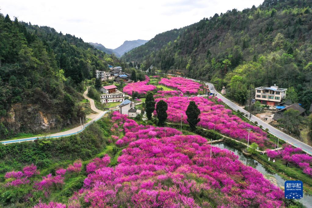 4月7日在贵州省岑巩县天马镇玉门洞景区拍摄的紫荆花园(无人机照片)。 近日,位于贵州省黔东南苗族侗族自治州岑巩县天马镇玉门洞景区的紫荆花竞相绽放,引人入胜。 近年来,当地依托得天独厚的生态资源优势,让美丽乡村绽放“美丽经济”,不断激发乡村旅游活力。 新华社记者 杨文斌 摄