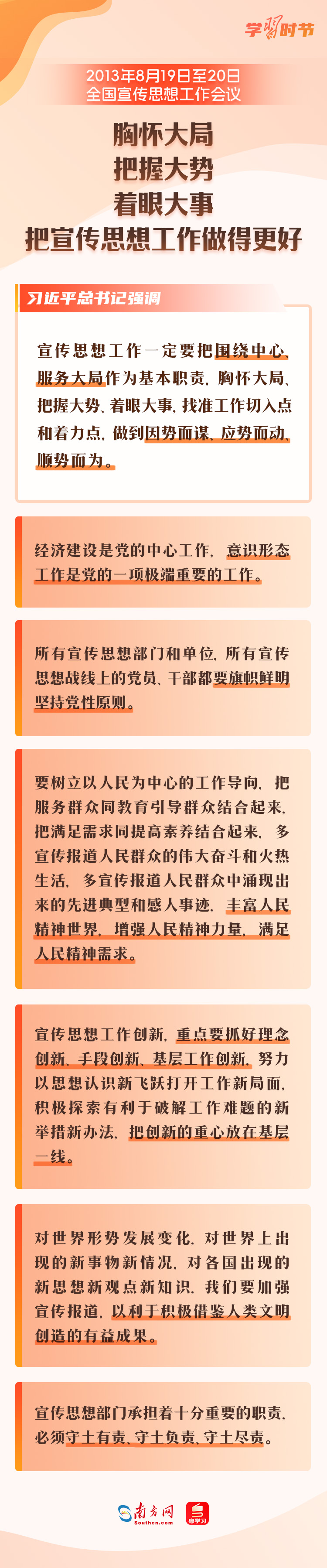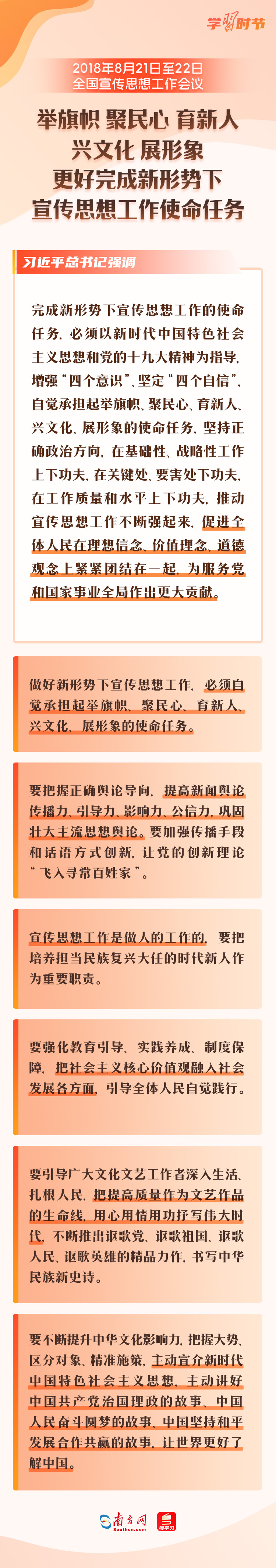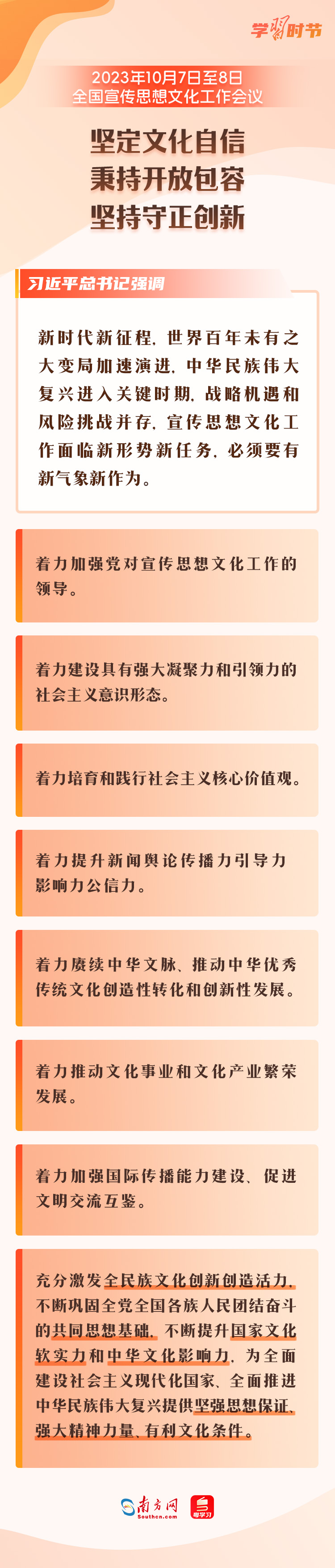10月7日至8日,全国宣传思想文化工作会议在北京召开,会上传达了习近平总书记关于宣传思想文化工作的重要指示,首次提出了习近平文化思想。 宣传思想文化工作事关党的前途命运,事关国家长治久安,事关民族凝聚力和向心力,是一项极端重要的工作。党的十八大以来,宣传思想文化工作之所以取得历史性成就,最根本就在于有习近平总书记领航掌舵,有习近平新时代中国特色社会主义思想科学指引。让我们一同回顾刚刚召开的全国宣传思想文化工作会议,以及2018年、2013年召开的两次全国宣传思想工作会议,看看总书记通过这三次会议,为宣传思想文化工作划出了哪些重点。