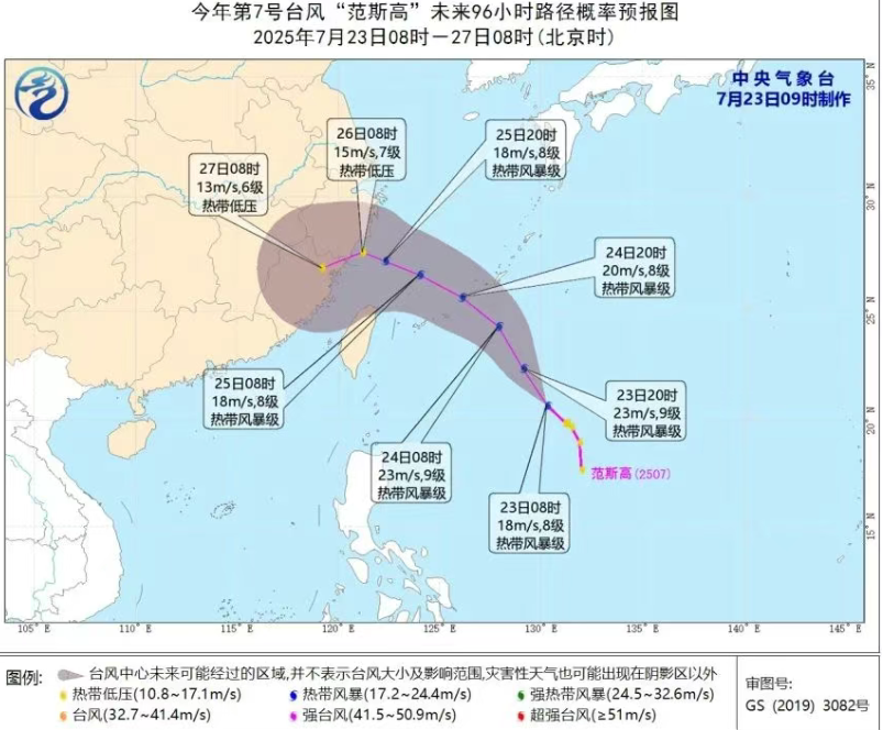 今年第7号台风"范斯高"(热带风暴级;英文名称:Francisco;名字来源:美国;名称意义:查莫罗(Chamorro)男子名)已于7月23日上午在菲律宾以东洋面生成,上午8点钟其中心位于浙闽交界东偏南方大约1230公里的洋面上。预计,"范斯高"将以每小时15-20公里的速度向北偏西方向移动,强度逐渐增强。24日夜间移入东海南部海面,最强可达热带风暴级或强热带风暴级(9-10级,23-25米/秒),并向浙江南部到福建北部一带沿海靠近。