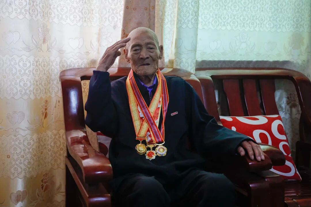 胡绍星庄严敬礼 “父亲一辈子不爱说话,可那些证上的红章,比任何语言都有分量。”胡天文回忆,第一次帮父亲整理旧物时,指尖抚过“中国远征军”“第四野战军”“抗美援朝”等字样,才惊觉父亲竟把大半个世纪的家国记忆,都锁进了沉默里。 有时家庭聚餐,晚辈们聊起谁去了哪个国家旅游,老人会突然插一句玩笑,“你们都没我本事,我出过两次国。”众人笑起来时,他自己也咧开嘴,眼里闪过一丝不易察觉的自豪——那是远征军入缅作战、抗美援朝跨过鸭绿江的岁月,藏在玩笑里的,是他从未细说的血与泪。 1942年,胡绍星的家乡浙江省义乌市苏溪镇遭到日寇入侵,百姓被残忍屠杀。19岁的胡绍星含泪加入了当时国民革命军。1942年3月,他所在部队组成中国远征军,入缅与日军展开滇缅路作战。1943年到1945年,他随广元汽车二团组成的中国远征军继续参战。 在缅北滇西的崇山峻岭中,他和战友们用血肉之躯抗击日军,把“不怕死”三个字刻进了骨子里,与日军在异国激战。1945年,他被编入新组建的汽车二十团,成了一名驾驶兵,随部队辗转,从昆明到兰州,再西行至新疆哈密。 “那会儿他哪懂什么番号,只知道跟着队伍走,打跑鬼子就行。”胡天文说,父亲总回避谈论战斗细节,唯独提到1945年8月日本投降那天,会突然挺直腰板,那天他在哈密的营房外,对着南方连磕三个头,“爹娘,我终于能回家了”。 顺昌县退役军人事务局副局长林禧,是近年来常来探望胡绍星的人之一。“第一次上门采集信息时,老人只说自己‘当过兵’,多一个字都不肯讲。”林禧笑着说,后来还是在胡天文的帮助下,才一点点拼凑出这段震撼的经历,“像胡老这样的老兵,把功勋藏在心底,把奉献融进生命,是我们最该敬重的人。”