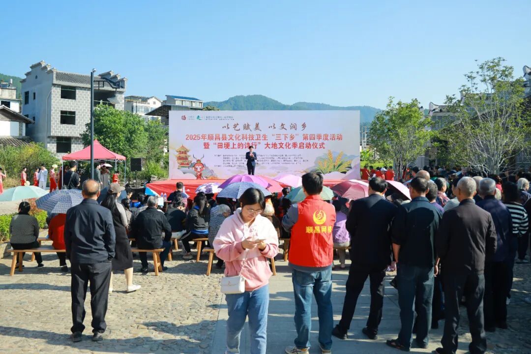10月24日,以“以艺赋美 以文润乡”为主题的2025年顺昌县文化科技卫生“三下乡”第四季度活动暨“田埂上的诗行”大地文化季启动仪式在顺昌县元坑镇举行。在文化特派员工作机制牵引下,26个县直单位走进元坑,积极发挥文艺助力乡村全面振兴的作用,努力满足农民群众的精神文化需求,把惠民服务送进千家万户,把科技知识送到田间地头。南平市委宣传部副部长施萍,县委常委、宣传部部长卢常传,县委宣传部、团县委、县文联等相关单位负责同志及元坑镇党政主要领导出席活动。