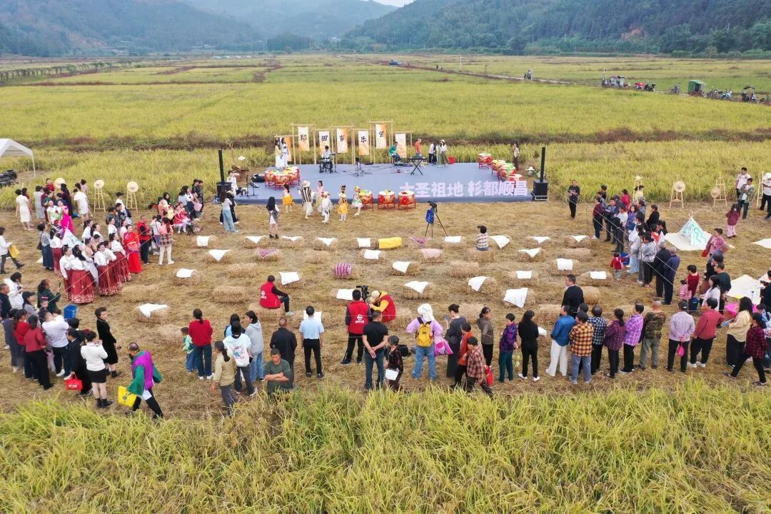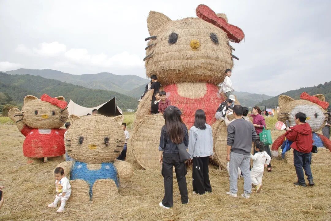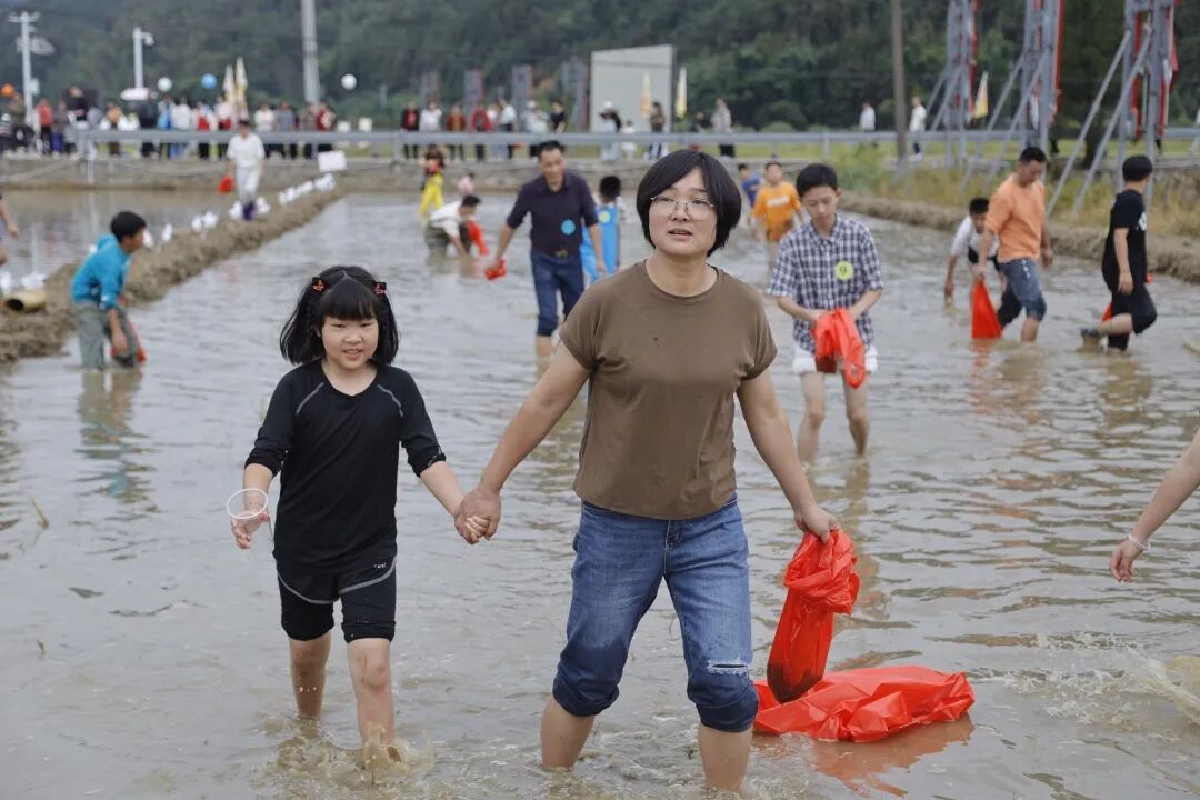 游园会的舞台直接搭建在稻田之中,一个个精彩节目轮番上演。游客坐在稻浪间欣赏演出,享受别样的感官体验。除了音乐表演,“我在村里有块田”主题打卡区内,5米高的萌趣稻草人阵营格外引人注目,家长带着孩子穿梭其间,欢笑声与稻香一同弥漫田间。 田间竞赛环节则让游客真正“沉浸式”触摸农耕的温度。割稻比赛现场,参赛者挽起裤脚、踏入松软的泥田,手持镰刀与金黄的稻穗“较劲”。另一边的抓稻花鱼、摸田螺以及拔河比赛更添野趣:孩子们赤脚踩进水洼,追逐溜窜的稻花鱼,指尖触碰滑嫩的田螺;大人们也童心未泯,比速度、拼技巧,四溅的水花与阵阵欢呼仿佛掀翻了整片稻浪。