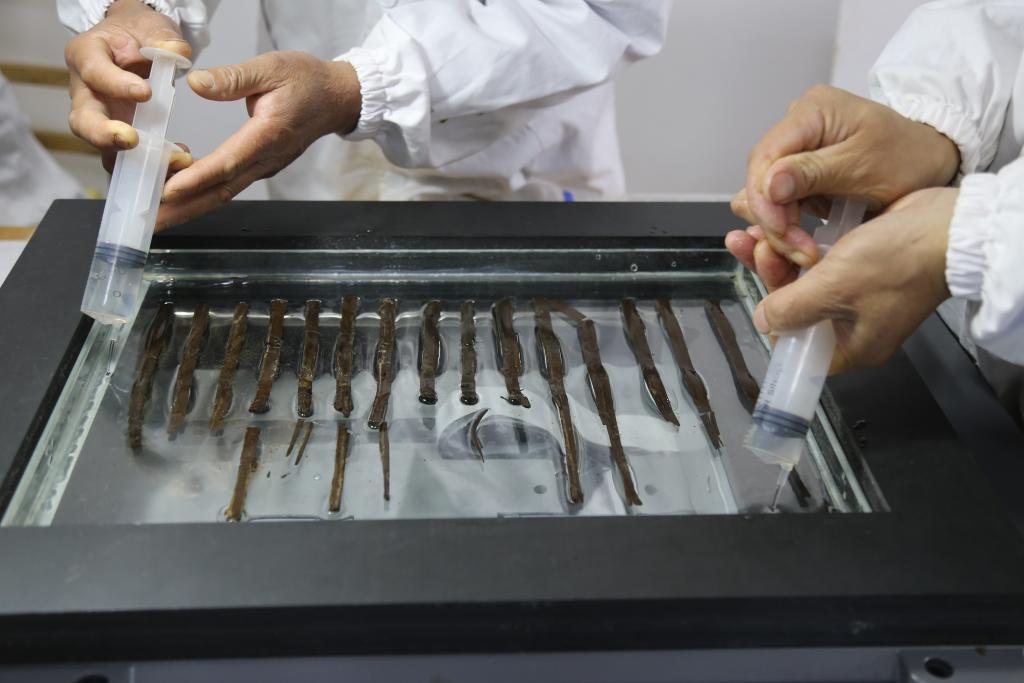 图为文保人员正在进行竹简保护工作。(江西省文物考古研究院供图) 南昌汉代海昏侯墓考古发掘成果公布十周年暨汉代区域文化学术研讨会11月7日至9日在南昌举办。方北松在8日的主旨发言中表示,大部分简牍的保护工作已完成,剩余部分预计在2026年完成。其中,包括514枚竹简的整理揭剥、清洗等保护工作,以及1840枚竹简的脱水、修复、封护等保护工作。