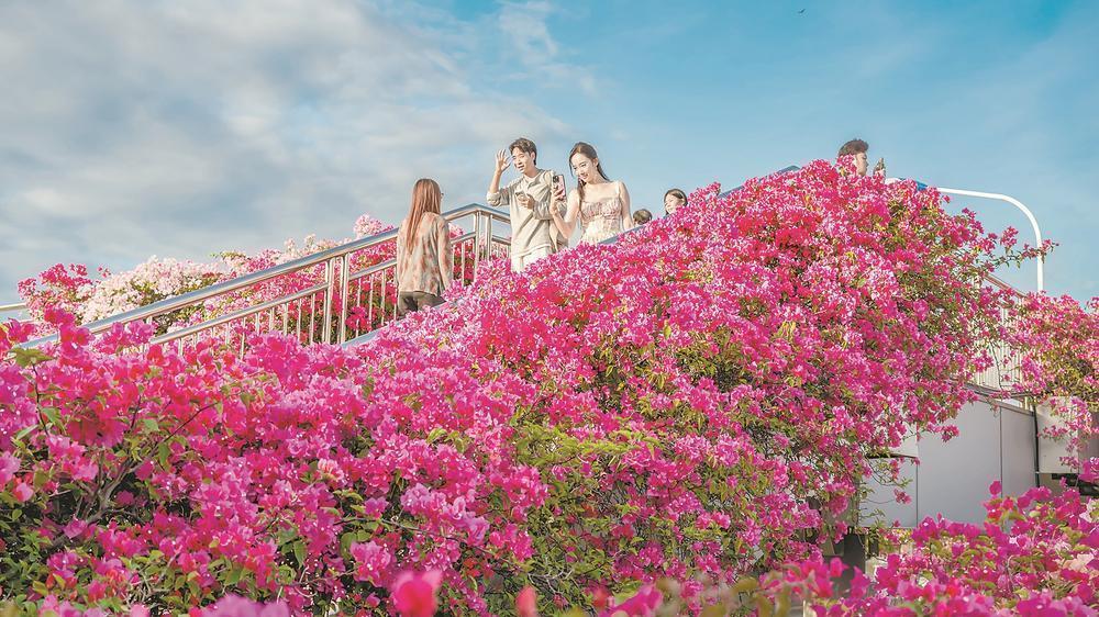 近日,厦门“市花”三角梅迎来盛放期,紫色、玫红、大红、橙黄等各色三角梅装点着各大公园和城市街头的高架桥、人行天桥。图为集美杏滨路高浦人行天桥三角梅灿烂绽放,花开如瀑。