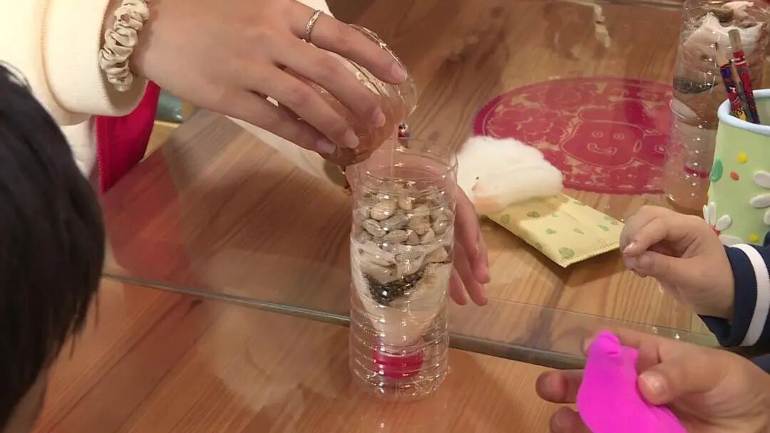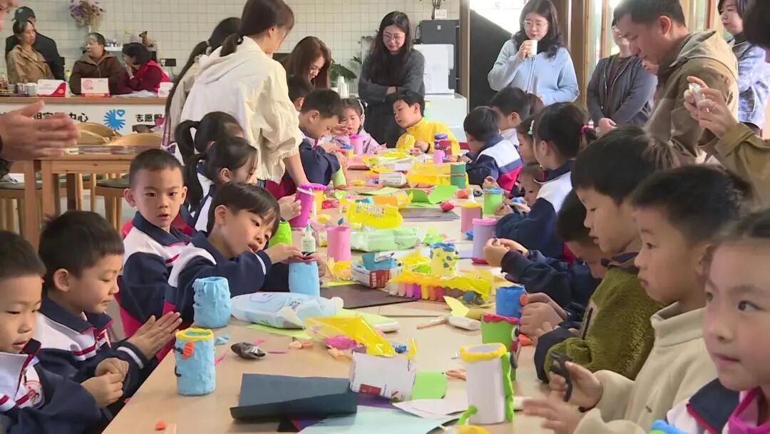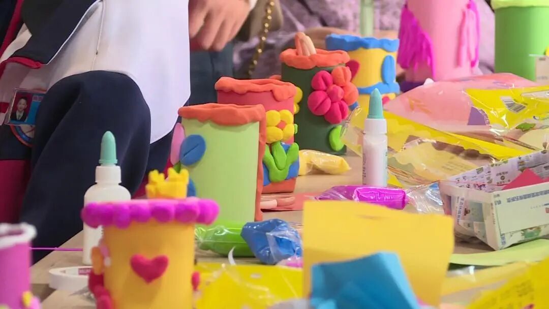 在东安驿零碳生活馆内,孩子们在手工老师的带领下,将塑料瓶经过裁剪、贴彩纸、上黏土等系列操作,变身成实用的笔筒。