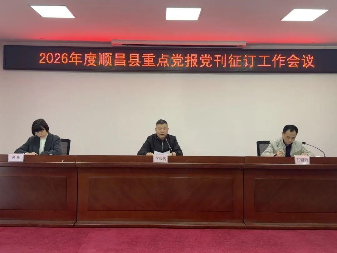 11月21日,顺昌县召开2026年度重点党报党刊征订工作会议,回顾总结2025年全县重点党报党刊征订工作,安排部署2026年征订任务,县委常委、宣传部部长卢常传出席会议并作讲话。县重点党报党刊征订工作领导小组成员,各乡镇(街道)党(工)委书记、宣传委员,县直机关、企事业单位党组(党委、工委)书记,条管单位领导以及邮政支局长等70余人参加会议。