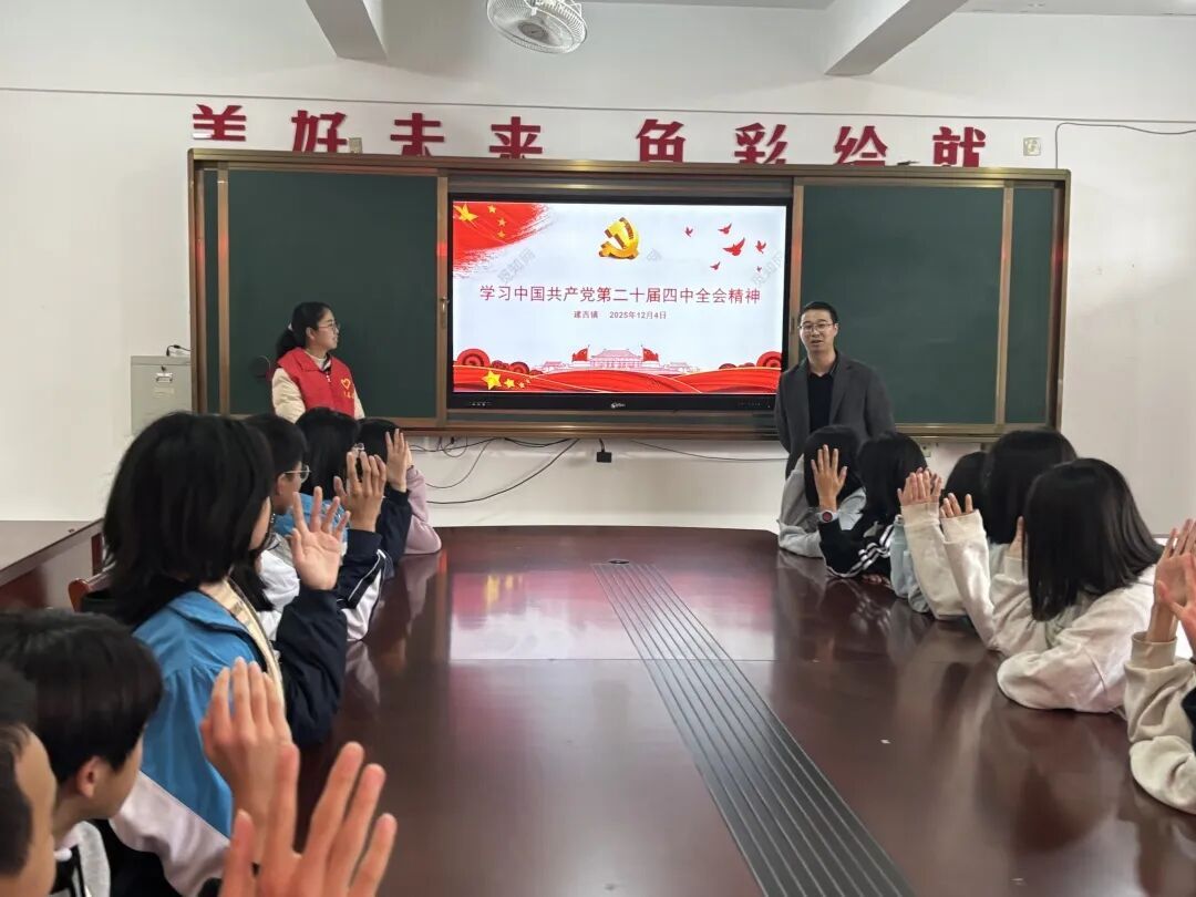 当天上午,宣讲团走进际会中学,以“宪法与成长·全会精神我践行”趣味问答开场。“同学们,党的二十届四中全会强调‘坚持依宪治国’,咱们身边的文化广场、安全校园,都是宪法保障民生的体现!”宣讲员从校园环境、家乡变化切入,将“中国式现代化”“治理现代化”等主题与宪法赋予的权利义务紧密联系。学生们踊跃互动,气氛热烈。初三学生高卓妍感慨:“原来宪法和国家政策就在我们身边!”