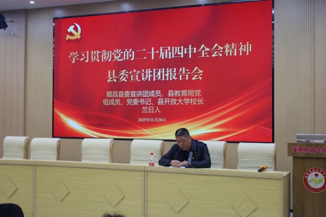 吴志斌紧扣全会精神要义,对全会作出的重大决策部署进行了全面系统的解读和深入浅出的阐释。立足顺昌统战工作实际,他重点围绕推动全会精神在全县统一战线落地见效展开论述,鼓励广大民主党派成员、无党派人士及民营经济代表人士积极发挥自身优势,聚焦中国式现代化顺昌实践,多建睿智之言、多献务实之策、多尽发展之力。 与会人员一致认为,此次宣讲内容深刻、联系实际,既有理论高度,又有实践指导性。通过学习,进一步加深了对党的二十届四中全会精神核心要义和实践要求的理解,更加明确了在新时代新征程中的使命担当。下一步,将切实把学习成果转化为服务大局、履职尽责的实际行动,为顺昌县全方位绿色高质量发展贡献更多智慧和力量。 县教育局 近日,学习贯彻党的二十届四中全会精神县委宣讲团到顺昌金桥学校开展宣讲。县委宣讲团成员、县开放大学校长兰日人作宣讲报告。全县教育系统基层支部骨干党员代表、金桥学校师生等二百多人聆听了宣讲。