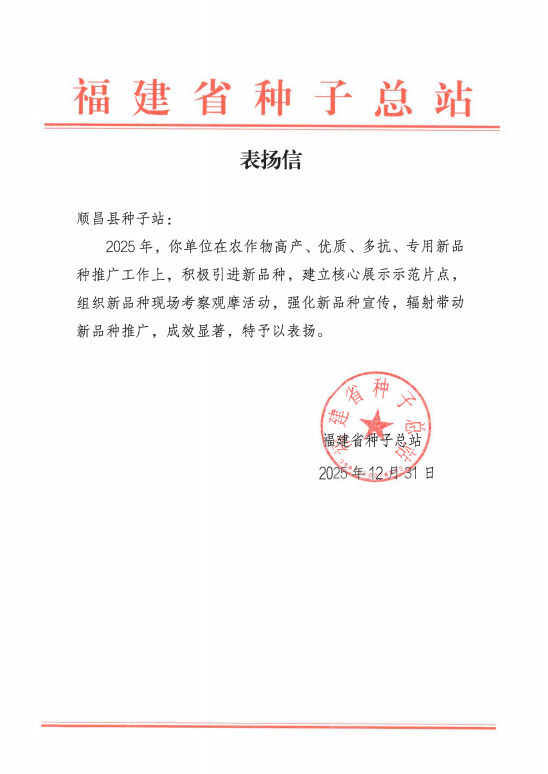 近日,顺昌县种子站收到了福建省种子总站的表扬信。信中,省种子总站对顺昌县2025年度农作物品种示范推广工作取得的显著成效表示了肯定,并予以表扬。 2025年,根据顺昌县出台的《2025年稳定发展粮食生产九条措施》,顺昌县农业农村局主导实施了2025年粮油规模种植主体单产提升项目,下达资金25万元,支持家庭农场、合作社等水稻规模种植主体。顺昌县种子站承担的优质稻品种示范推广项目,通过集成应用新品种、新机具、新技术等措施,建立优质稻产业化发展关键技术应用百亩示范片18个,示范面积2000多亩,并组织种粮大户召开现场观摩会和优质米品鉴会,起到了很好的辐射带动作用,促进我县水稻良种更新和标准化生产,项目区水稻单产比非项目区提升10%以上。同时,还组织实施“福建省国家级优质稻品种展示与评价”及“水稻低镉品种试验”项目,为全省优质稻新品种示范推广提供理论支撑。 这封表扬信,不仅是对顺昌种子站工作的肯定,更是对顺昌农业农村系统工作者以实际行动践行服务“三农”宗旨、助力乡村振兴的高度褒奖。 顺昌县农业农村系统工作者纷纷表示,将以此次省站的鼓励为新的起点,继续秉持初心使命,不断提升业务水平和服务能力,以更加饱满的热情、更加务实的作风,投身于服务农业、农村、农民的光荣事业中,为全方位夯实粮食安全根基、加快推进顺昌农业农村现代化作出新的更大贡献。 |