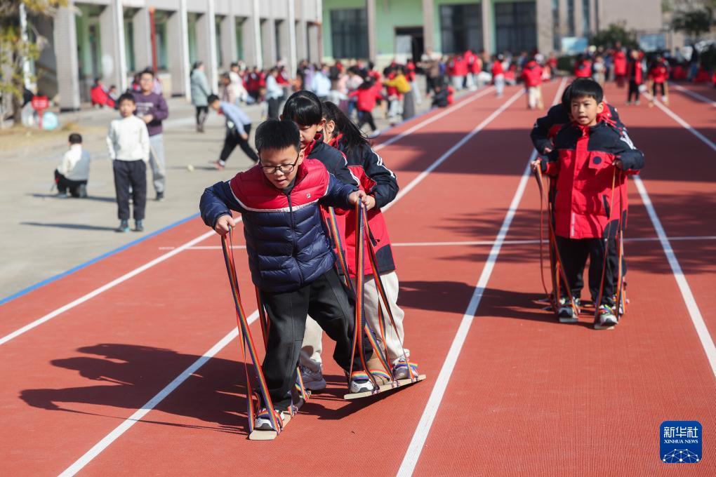 1月9日,诸暨市陶朱街道城西小学的学生在操场上踩高跷。 近期,为丰富学生课间生活、传承中华优秀传统文化,浙江省诸暨市陶朱街道中心学校下属各小学开设了传统游戏课程,打陀螺、跳房子、踩高跷等多项传统游戏让学生们玩得不亦乐乎。 新华社记者 徐昱 摄