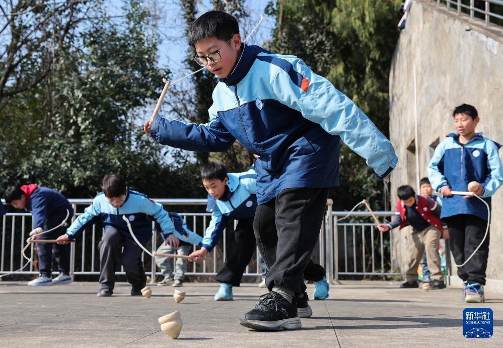 1月9日,诸暨市陶朱街道白门完小的学生在操场上打陀螺。 近期,为丰富学生课间生活、传承中华优秀传统文化,浙江省诸暨市陶朱街道中心学校下属各小学开设了传统游戏课程,打陀螺、跳房子、踩高跷等多项传统游戏让学生们玩得不亦乐乎。 新华社记者 徐昱 摄