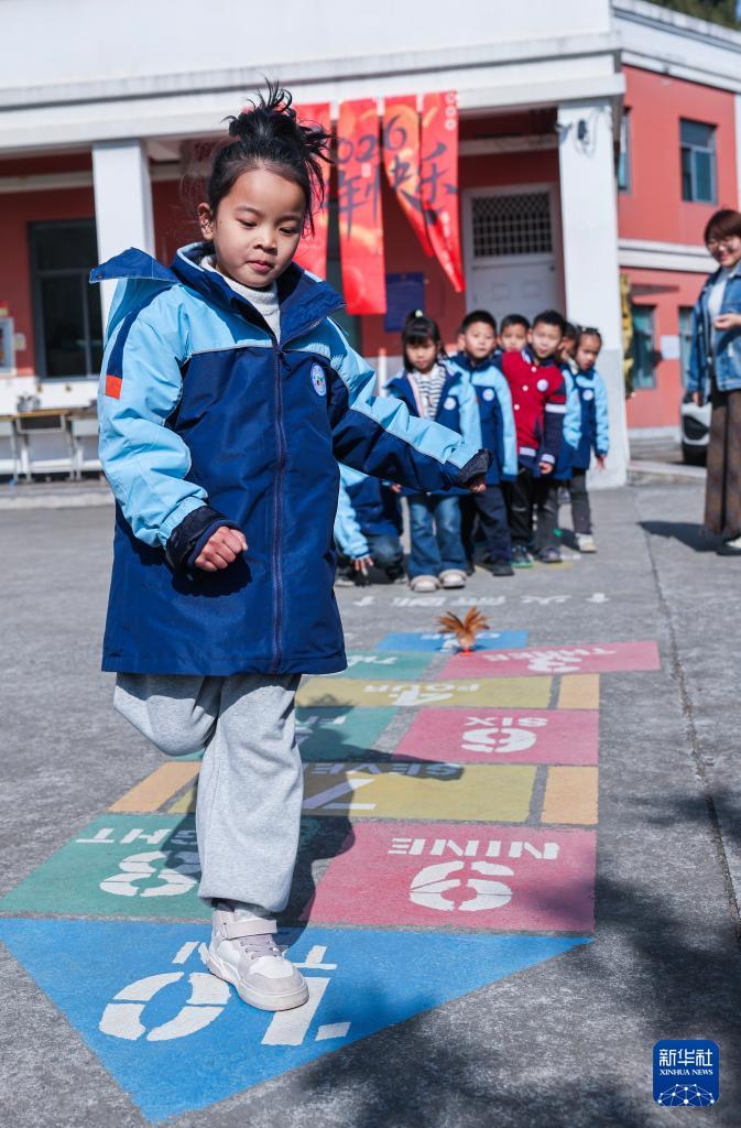 1月9日,诸暨市陶朱街道白门完小的学生在跳房子。 近期,为丰富学生课间生活、传承中华优秀传统文化,浙江省诸暨市陶朱街道中心学校下属各小学开设了传统游戏课程,打陀螺、跳房子、踩高跷等多项传统游戏让学生们玩得不亦乐乎。 新华社记者 徐昱 摄