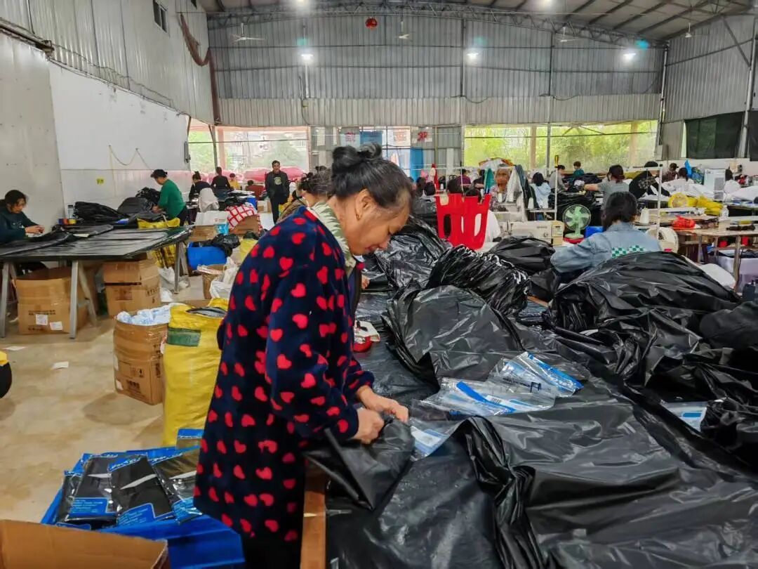 1月7日,一群女工正在金顺共富工坊生产线上熟练操作,有的女工在缝制桌布,有的女工在装袋,有的女工在打包发货,甚至还有女工在指导新人操作……一张张整洁的一次性桌布正有序产出,工坊内一派繁忙的景象。