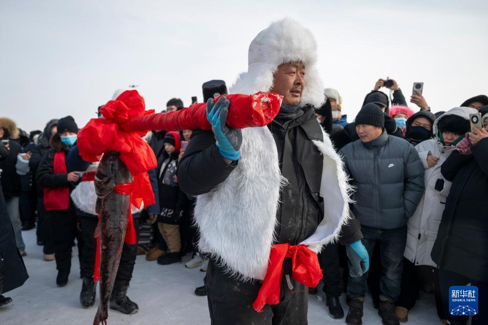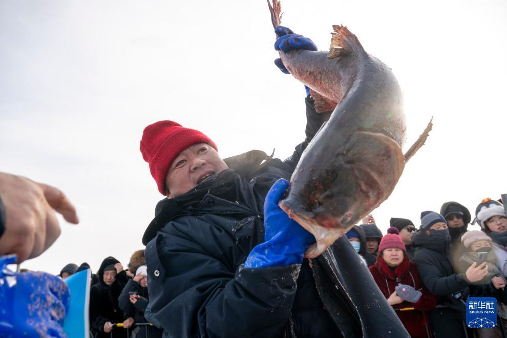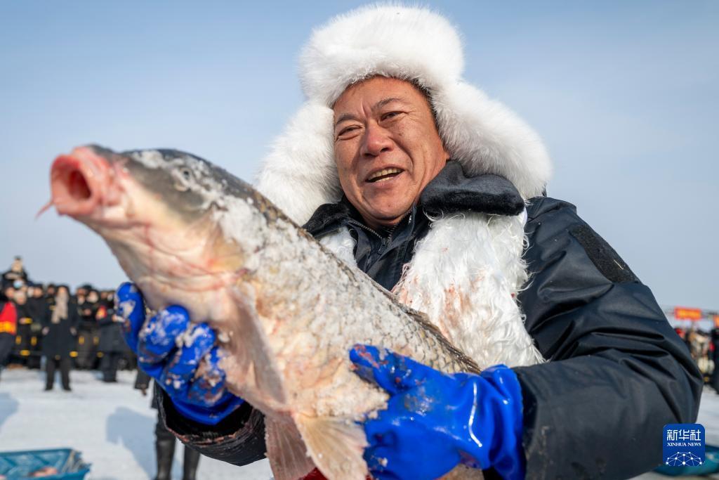 1月17日,在2026年兴凯湖冬捕节现场,渔民展示刚刚冬捕上来的鱼。 新华社记者 张涛 摄