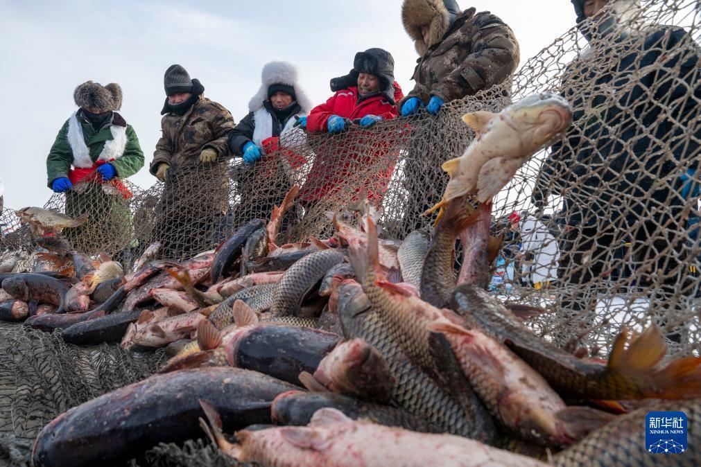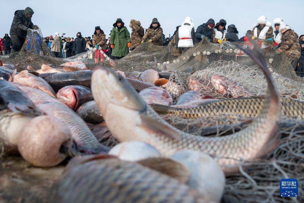 1月17日,在2026年兴凯湖冬捕节现场,渔民将渔网拽出冰面。 1月17日,2026兴凯湖冬捕节在中俄界湖兴凯湖畔启幕。人们在现场共同见证千米大网破冰而出,万鱼腾跃竞逐的震撼场景,感受传承千年的肃慎渔猎文化,体验北国边境冰雪文化独特魅力。 本届冬捕节以“文化+体育+旅游”融合发展为理念,精心打造全链条沉浸式体验矩阵,将“冷资源”转化为“热产业”。 新华社记者 张涛 摄