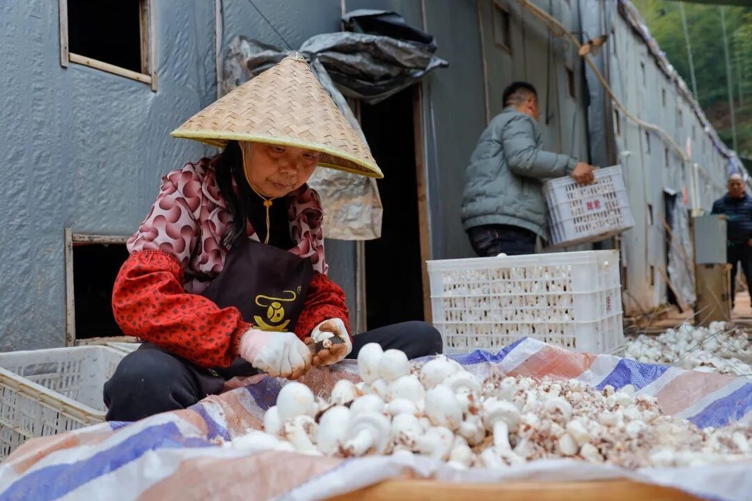 蘑菇产业不仅让土地“活”了起来,更让村民的腰包“鼓”了起来。基地为周边村民提供就业岗位约150个:中青年劳动力可以参与采菇、洗菇,薪资按蘑菇重量核算,多劳多得;老年人则能参与择菇、剪柄等轻松活计,在家门口实现增收。便捷的就业机会,还吸引了不少像廖火娥一样的外出务工人员返乡发展,既照顾了家庭,又有了稳定收入。
