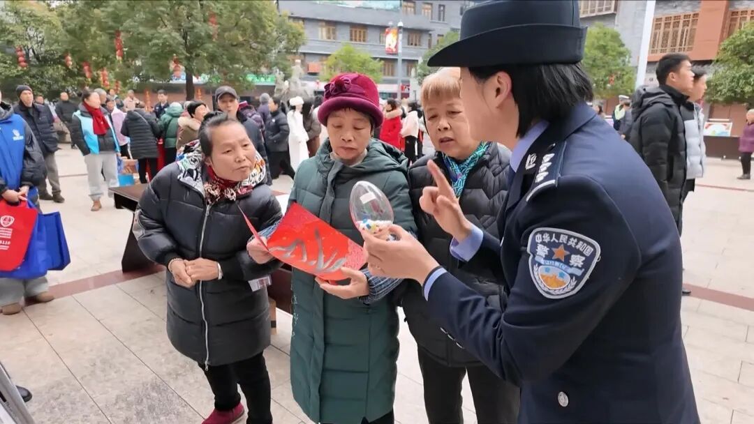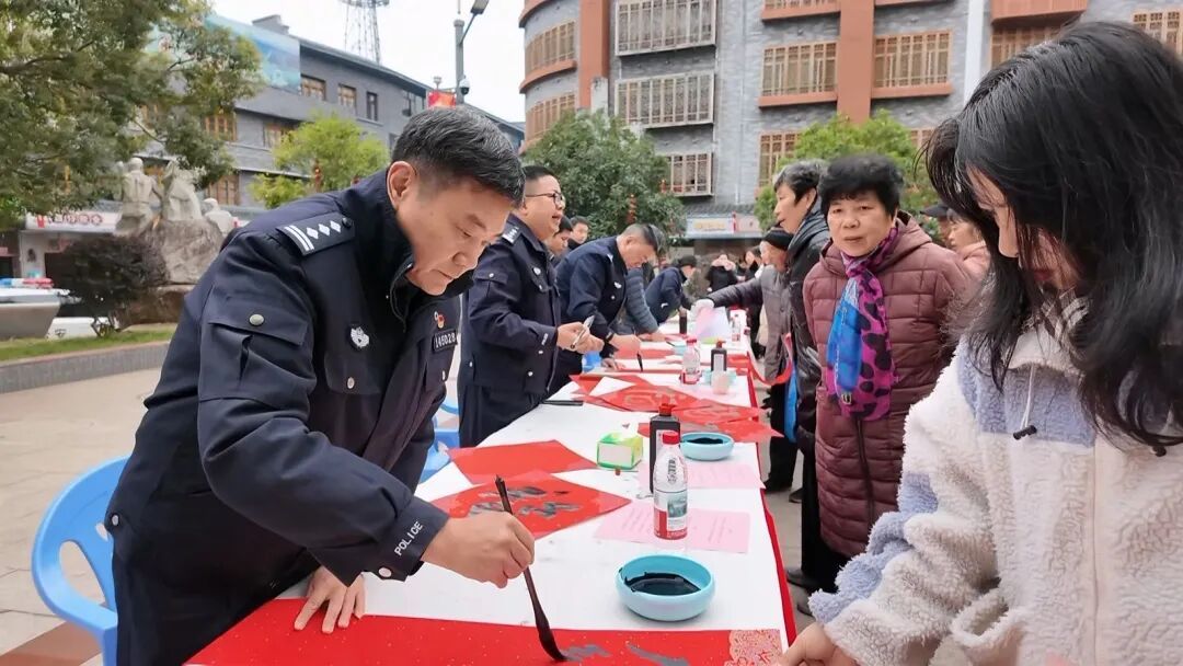 活动现场,文艺小分队通过歌曲、舞蹈、魔术等形式,生动呈现公安主题宣传展示,聚焦民警执勤与为民服务场景,以接地气的表演展现公安队伍的担当。书法小分队铺纸研墨,现场书写融入公安特色的春联与“福”字,受到群众热烈欢迎,大家争相领取,喜悦洋溢。普法宣传小分队则组织趣味问答,与群众积极互动,普及反诈、交通、禁毒等安全知识,并赠送公安文创产品,有效提升群众的安全防范意识。现场气氛热烈。