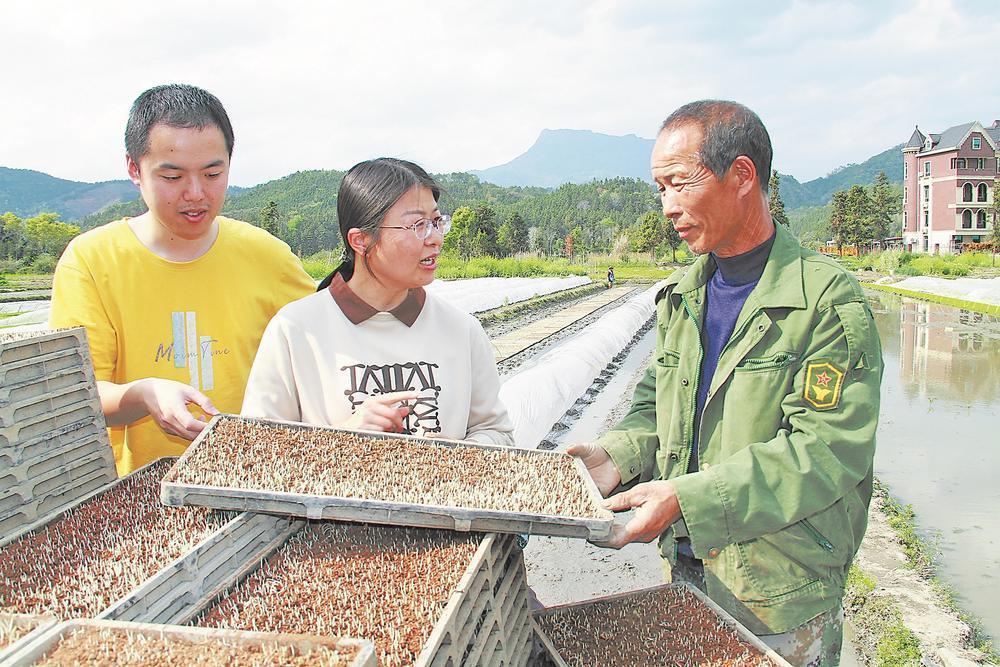18日,顺昌县气象局组织工作人员深入田间地头,服务春耕春播,为粮食稳产增收筑牢气象防线。图为顺昌县气象局技术人员在元坑镇谟武村田间查看秧苗长势,为进行育秧作业的农民提供气象咨询服务,并提出生产建议与防御措施。陈柏材 蔡元康 摄 |