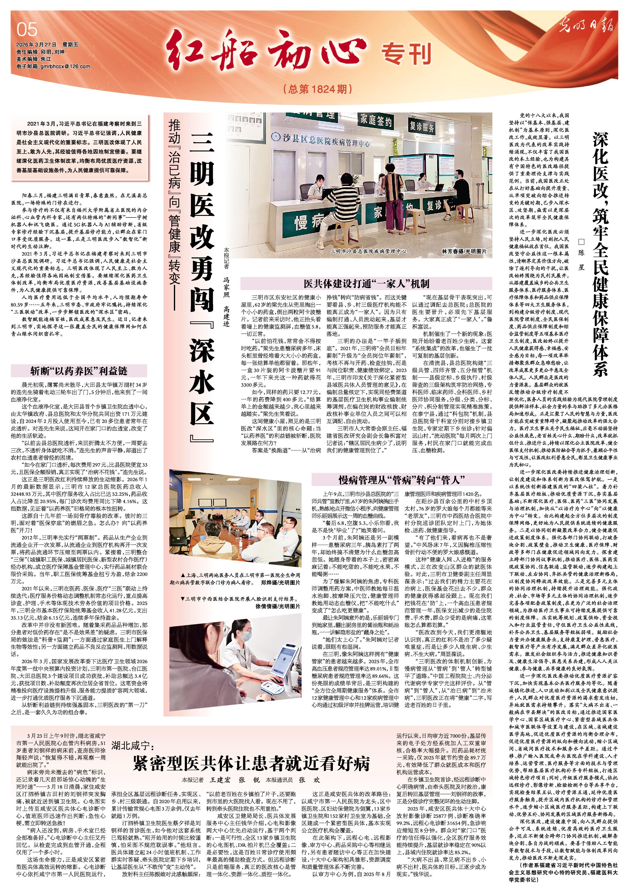 上海、三明两地医务人员在三明市第一医院全生命周期六病共管数字联合门诊为病人看诊。郑烨摄/光明图片 在距沙县百余公里的中村乡顶太村,76岁的罗大娘每个月都能等来“老朋友”,三明市中西医结合医院中村分院巡诊团队定时上门,为她体检、送药、做健康指导。 “有了他们来,看病再也不是奢望。”中风卧床7年,又因胸椎压缩性骨折行动不便的罗大娘感慨道。 这种“健康入网、人进格”的服务模式,正在改变山区群众的就医体验。对此,三明市卫健委副主任周显葆表示:“过去我们的精力主要花在治病上,医保基金花出去不少,群众的健康获得感却没跟上。现在我们把钱花在‘防’上,一个高血压患者规范管理一年,医保支出减少的是住院费、手术费,群众少受的是病痛,这笔账怎么算都划算。” “医改改到今天,我们更清醒地认识到,真正的红利不是治了多少疑难重症,而是让多少人晚生病、少生病、不生大病。”周显葆说。 “三明医改的体制机制创新,为慢病管理从‘管病’到‘管人’转型铺平了道路。”中国工程院院士、内分泌代谢病学专家宁光这样评价。从“管病”到“管人”,从“治已病”到“治未病”,三明医改正在将“健康”二字,写进老百姓的日子里。 深化医改,筑牢全民健康保障体系 作者 陈星 党的十八大以来,我国坚持以“保基本、强基层、建机制”为基本原则,深化医改工作,成效显著。以三明医改为代表的改革实践持续涌现,不仅丰富了我国医改的本土经验,也为构建具有中国特色的医改路径提供了重要理论支撑与实践范例。当前,我国医改正处在从打好基础向提升质量、从单项突破向综合推进转变的关键时期,已步入深水区、攻坚期,亟需以更深层次的改革筑牢全民健康保障体系。 进一步深化医改必须坚持人民立场,时刻把人民健康福祉放在首位。我国医改坚守公益性这一根本属性,清晰界定其价值方向,破除了逐利导向的干扰,让医改始终围绕为民利民展开。从搭建覆盖城乡的公共卫生服务体系、医疗服务体系、医疗保障体系和药品供应保障体系等四大卫生服务体系,到构建分级诊疗制度、现代医院管理制度、全民医保制度、药品供应保障制度和综合监管制度等五项基本医疗卫生制度,医改始终以提升人民健康获得感、幸福感、安全感为目标,每一项改革举措都聚焦群众急难愁盼,让改革成果更多更公平惠及全体人民。人民群众是医改的力量源泉。基层群众的就医反馈推动分级诊疗制度不断优化,医务人员的实践经验为现代医院管理制度提供鲜活样本,社会力量的参与助推了多元办医格局加速形成。正是汇聚了人民的智慧与力量,医改方能在突破重重障碍中,凝聚起推动改革的强大合力。医疗卫生事业关乎民生福祉,应毫不动摇坚持公益性底色,老百姓关心什么、期盼什么,改革就抓住什么、推进什么,持续以深化公立医院改革、健全医保支付机制、推动医防融合等为抓手,兼顾公平性与可及性,让医改红利普惠全民,彰显卫生健康事业为民初心。 进一步深化医改要持续推进健康治理创新,让制度建设和体系创新为医改保驾护航。一是以系统性创新搭建医改的“四梁八柱”。着力补齐基层医疗短板、推动优质资源下沉,夯实基层基础;不断深化医疗、医保、医药“三医”协同发展与治理机制,加快从“以治疗为中心”向“以健康为中心”转变。由此构建起全方位多层次的制度保障网络,更好地为人民提供系统连续的健康服务。二是以协同创新凝聚改革合力,健全健康促进政策制度体系。强化各部门协同联动,打破条块分割、政策壁垒,推动卫生健康、医疗保障、财政等多部门在健康促进领域同向发力。探索建立跨部门协同议事机制,推动医疗、医保、医药实现政策协同、信息联通、监管联动,逐步构建起上下联动、左右协同、齐抓共管的健康治理新格局,以制度协同释放改革效能。三是完善多元主体的协同治理机制,持续提升治理效能。强化政府、社会、市场等多元主体的协同治理机制,逐步完善各项配套政策制度,在更为广泛的社会治理领域,为推动医疗卫生事业可持续发展提供可靠的制度保障。压实统筹规划、政策供给、资金投入和行业监管责任,守住医疗卫生公益性底线,补齐公共卫生、基层服务等短板弱项。鼓励社会力量兴办健康服务业,支持康复护理、普惠医疗、数智医疗等产业有序发展,满足群众差异化就医需求。激发社会组织参与活力,推进健康知识普及、健康生活倡导、医患关系共建,形成人人关注健康、参与健康、共享健康的良好氛围。 进一步深化医改要推动优质医疗资源扩容下沉,加快实现基本公共医疗服务均等化。随着城镇化推进、人口流动加剧以及全民健康意识提升,人民群众对优质医疗资源的渴求愈发迫切,异地就医需求持续攀升。落实“大病不出省、一般病在市县解决”的医改目标,通过推进国家医学中心、国家区域医疗中心、紧密型县域医共体和城市医联体等设置与建设,在区域、省域建设医学高地,促进优质医疗资源的均衡合理分布,促进优质医疗资源的纵向和横向流动,缩小区域间、省域间医疗技术和服务水平差距。通过平移、推广输入医院或牵头医院在学科建设、人才培养、运营管理、医疗服务等方面的技术与管理优势,帮助基层医疗机构补齐专科短板,打造区域特色诊疗项目;同