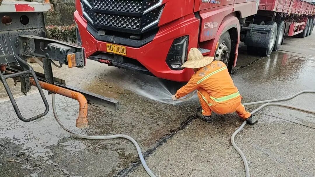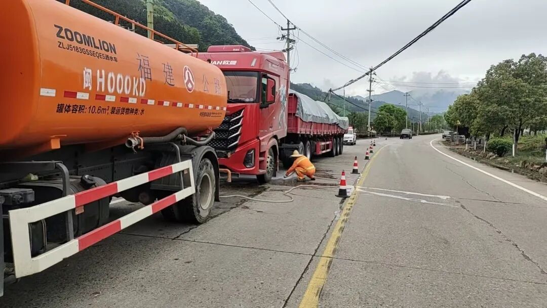 险情就是命令,处置刻不容缓。面对这一突发状况,顺昌公路分中心第一时间启动应急响应机制,紧急抽调一线养护人员和洒水车赶赴事故现场。养护人员一边设置安全警示标志,疏导过往车辆和行人,一边利用高压水流对泄漏的油污路面进行全面、彻底的冲刷清洗,确保路面无油污残留。
