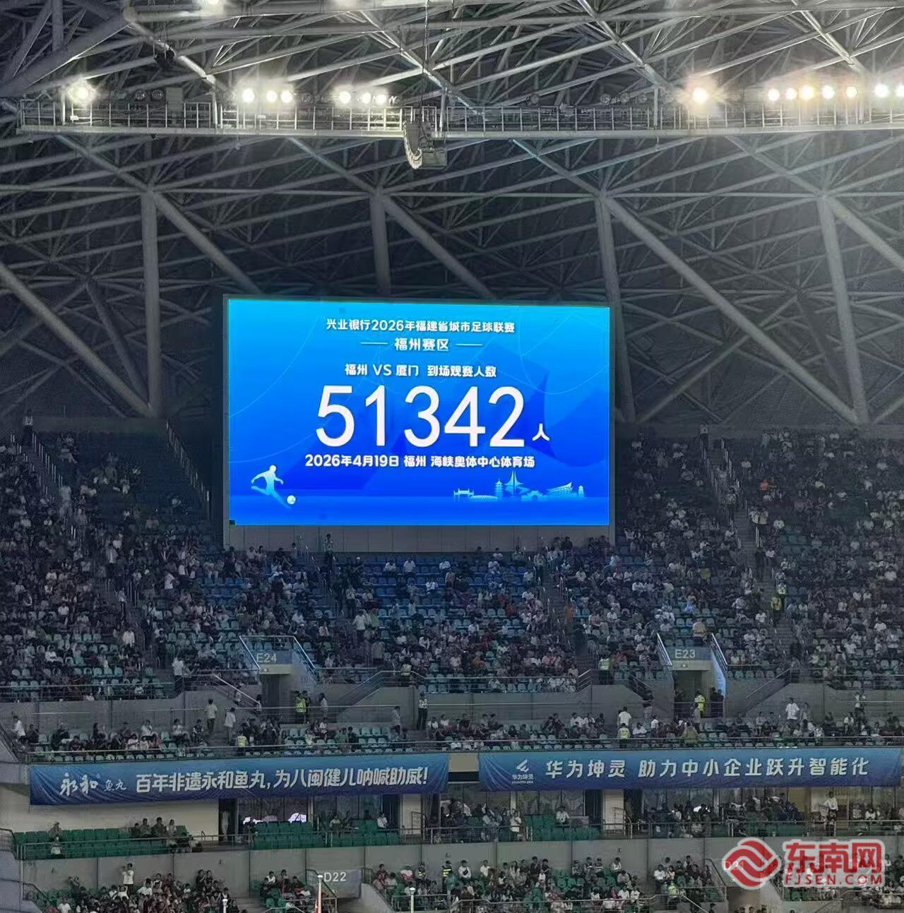 比赛现场。 东南网4月19日讯(本网记者 陈楠 卢金福 林夏悦 文/图)绿茵燃情,纪录诞生!4月19日晚,2026年福建省城市足球联赛(闽超)揭幕战在福州海峡奥体中心引爆全场,福州队主场迎战厦门队。经过激烈的比拼,福州队0:3不敌厦门队。