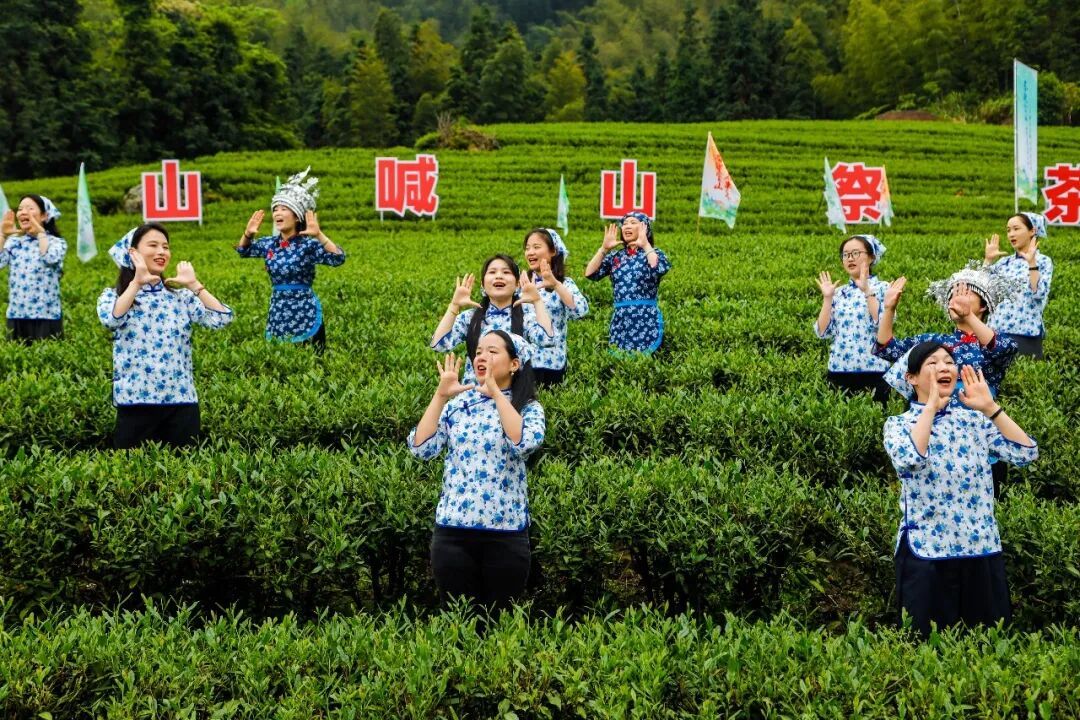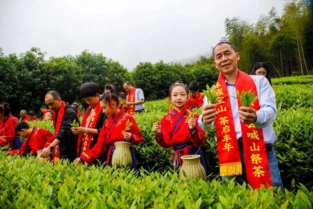 上午10时整,两声“丰收鼓”响彻山谷,现场气氛瞬间被点燃。伴随着庄重的古乐,敬献贡品、敬香、敬茶等环节依次进行。茶人手持清香,恭敬礼拜,祭文诵读声在山间回荡,字字句句诉说着对天地的感恩、对茶芽的期盼。随着铜锣声响,采茶女、采茶童和“茶仙子”齐声喊山,喊声此起彼伏,回荡在茶园之间,仿佛唤醒了沉睡的茶芽。紧接着,采茶童手提小背篓,步入茶垄,采下今春第一捧灵芽,标志着茶园正式开园采摘。