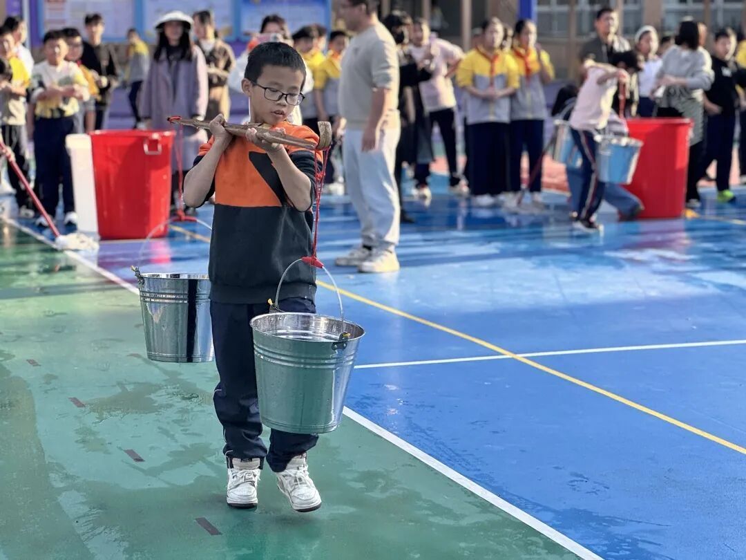 赛前,各班经过充分准备与选拔,各自推选出男、女生各6名选手代表班级出战。一条10米长的赛道,任务因年级而异:一年级进行夹弹珠接力,考验手眼协调;二年级沉稳地单手提水疾走;三年级升级为端水接力,力求平衡与速度;四年级选手双手拎桶,展现力量与技巧;五、六年级则体验了传统的挑水接力,扁担在肩,步伐稳健。裁判团队一丝不苟,精确计时与称重,确保了赛事的公平公正。